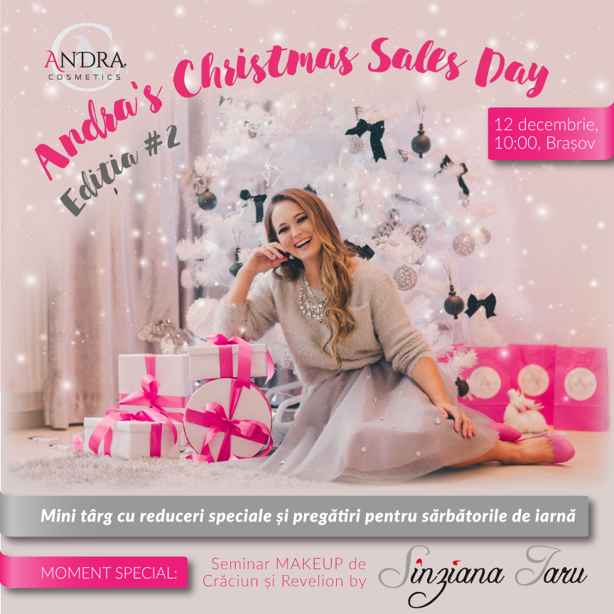 5. Participati la Andra’s Christmas Sales Day, un eveniment tare drag mie, realizat pentru ca stiu ca asa i-ar fi placut lui tata, in care am un INVITAT SPECIAL, pe Sinziana Iaru. Aceasta va sustine un seminar de 4 ore, cu demonstratie pe 2 machiaje, tematica Craciun si Revelion. Stiti deja ca ce iese din mana ei e cu pasiune si daruire, asa ca va asteptam sa va inscrieti. Pe langa asta, ofertele la produse vor fi de nerefuzat.