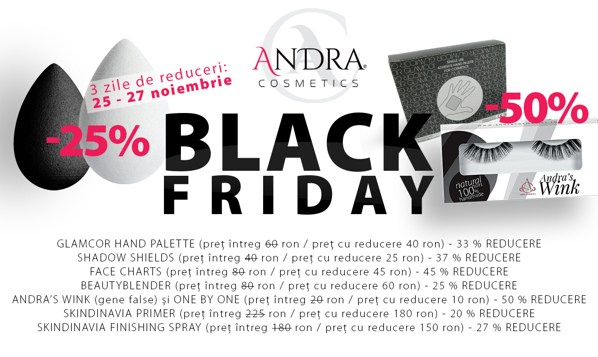 Eu am hotarat sa respect data de Black Friday din USA, asa ca voi incepe seria de reduceri pe 25 noiembrie si o voi incheia pe 27 noaptea la 23:59. Reducerile trebuie sa fie atractive, asa ca va asteapta un pret magnific de 10 lei pentru gene si beautyblender la 60 de lei. Daca aveti chef de cumparaturi si aveti stocuri de umplut va astept cu o comanda. Lista completa de reduceri o aveti mai jos. Shopping placut!